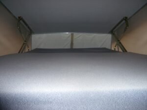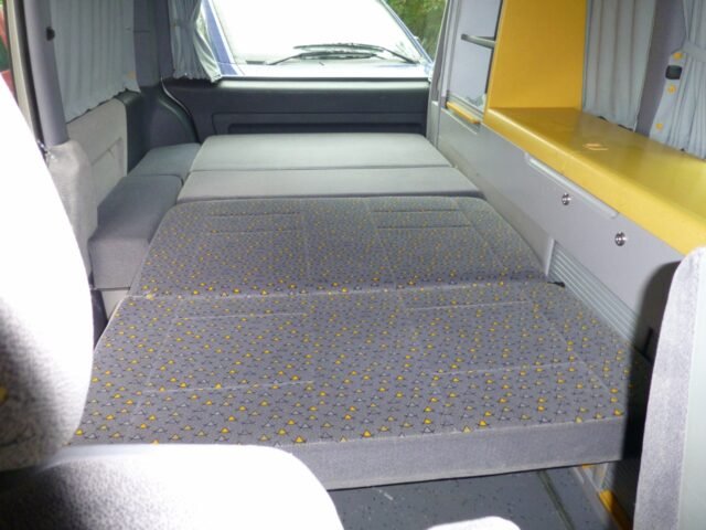 - Couchages (4 places) : Toit relevable Westfalia avec lit double et banquette convertible en lit double.