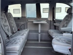 Salon : banquette se transforme en lit, table escamotable, sièges pivotant, 5 places. La banquette et la plage arrière sont fixées dans des rails permettant d’enlever facilement chacune d’elles séparément ou de les glisser vers l’avant ou l’arrière selon les besoins.